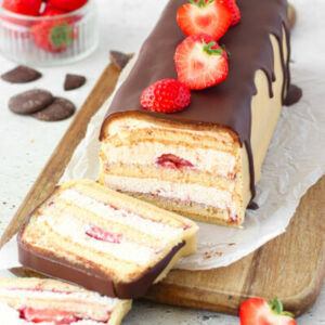 - Smelt de chocolade (steelpan via de au-bain-marie methode) of in de magnetron. Verdeel de chocolade over de bovenkant van de cake en maak af met wat verse aardbeien. Zet dan voor 1 uur terug in de koelkast. Daarna kun je de cake aansnijden. Let op dat je een scherp mes gebruikt. Tip: je kunt de mes even verwarmen onder de warme kraan, droog je mes af en daarna ‘glij’ je door de chocolade heen.